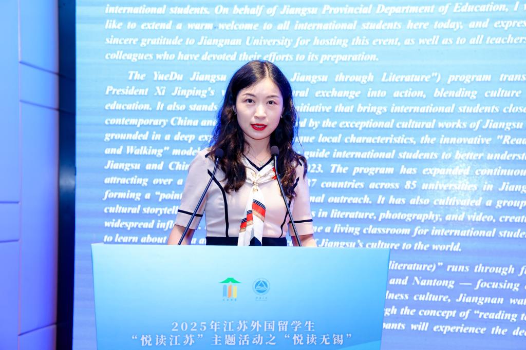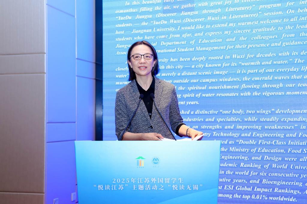 10月10日,2025年外国留学生“悦读江苏”主题活动之“悦读无锡”专场在江南大学正式拉开帷幕,来自全省23所高校、33个国家的外国留学生齐聚江南,以“水”为引,开启一场融合阅读与实践、串联历史与现代的无锡文化探寻之旅。副校长张影陆,江苏省教育厅对外合作与交流处四级调研员李勤径,江苏省高等教育学会外国留学生教育管理研究会副理事长兼秘书长张海军,无锡市人民政府外事办公室副主任叶诤,无锡市水利局副局长蒋勤芳等出席活动开幕式。