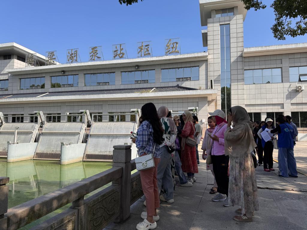 随后,队伍抵达第二站——技术先进的梅梁湖泵站。作为区域调水活水的“心脏”,泵站的现代化控制系统和高效运行模式引起了学生们的浓厚兴趣。他们围绕在巨大的水泵机组前,认真聆听工程师介绍其工作原理和在水环境综合治理中取得的成效,对中国运用高科技手段解决城市水问题、保障生态平衡的实践赞不绝口。