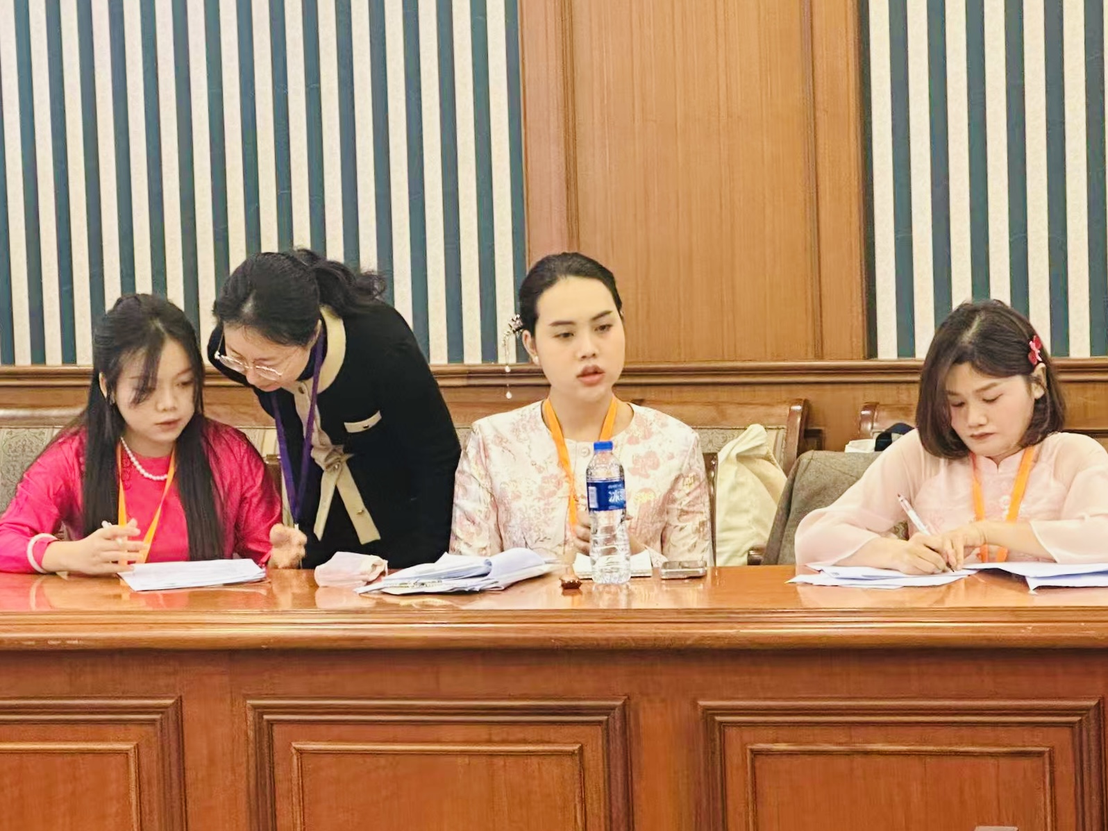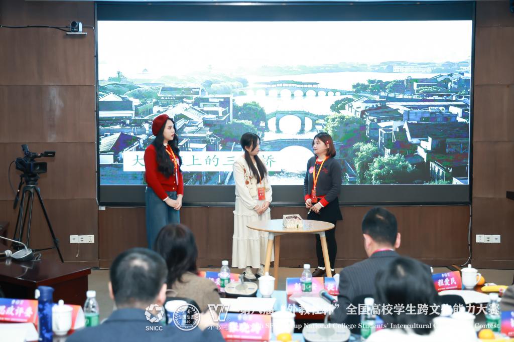 在全国决赛和总决赛的舞台上,各参赛团队围绕多元文化生活、公共外交、商务沟通三个主题展开高水平较量。此前在江苏省赛区摘得国际学生组特等奖的江南大学团队——数字科技与创意设计学院缅甸籍本科生赵怡熙(SOE SOE ZIN)、商学院越南籍硕士研究生杨玄庄(DUONG THI HUYEN TRANG)和商学院泰国籍硕士研究生王美美(SANSEN MANACHAI),在指导老师王伟炜的带领下再度出征,经过案例开发与展析、名言名句解读、知识问答、情境述评和讲述中国故事等多项比赛环节的考察,顺利晋级全国总决赛(全国仅10个国际学生团队获此资格),并最终斩获全国一等奖,实现江南大学在跨文化能力大赛中的历史性突破。